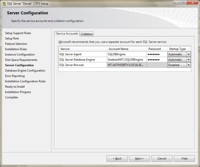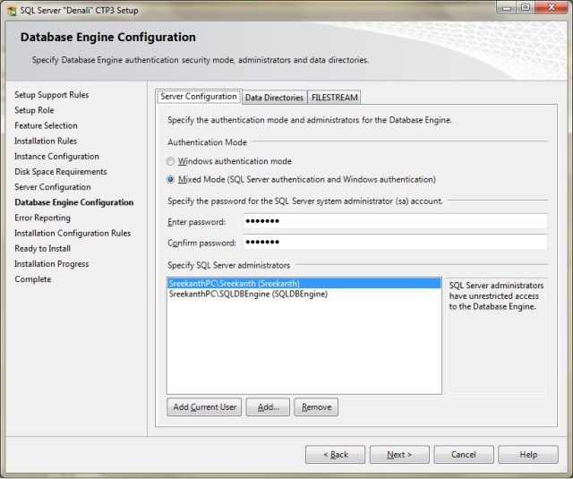 Now it’s time to choose your Authentication mode for your Denali Instance. I’ve chosen Mixed mode(this can be changed very easily even after installation). This is the place where you’ve to provide all your MDF/NDF and LDF file locations in the “Data Directories” tab. You’ve to choose atleast one account as a Sysadmin on this SQL Server. I would recommend to add Current User and SQL Server Service Accounts here as shown below.