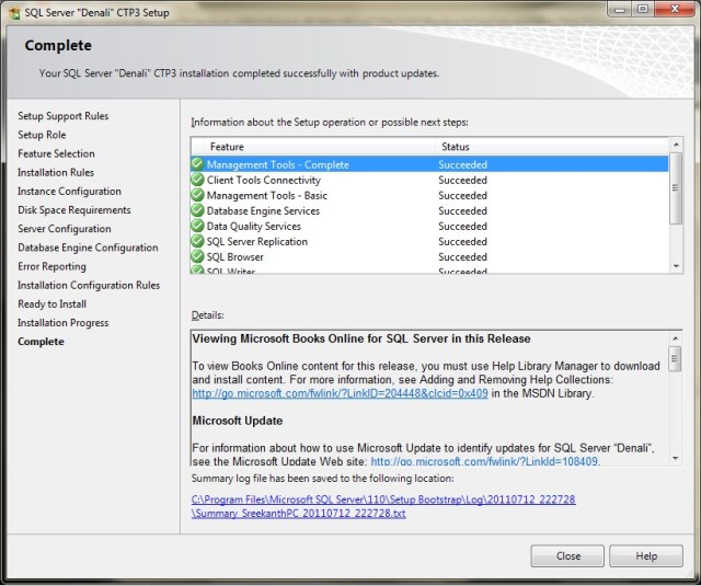 It took me around 15 minutes to finish the installation and got the below screen saying “COMPLETED”:). Am all set to Play with Denali Database Engine Now.( Except HADR, which requires DENALI to be installed on a Windows Cluster)