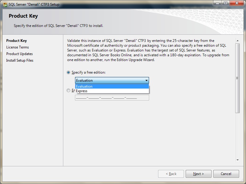 Choose Evaluation Edition as shown below for testing all the Enterprise Features and Read/Accept the License terms.(As mentioned in another blog post under the same label it’s a 180 Days eval version).
