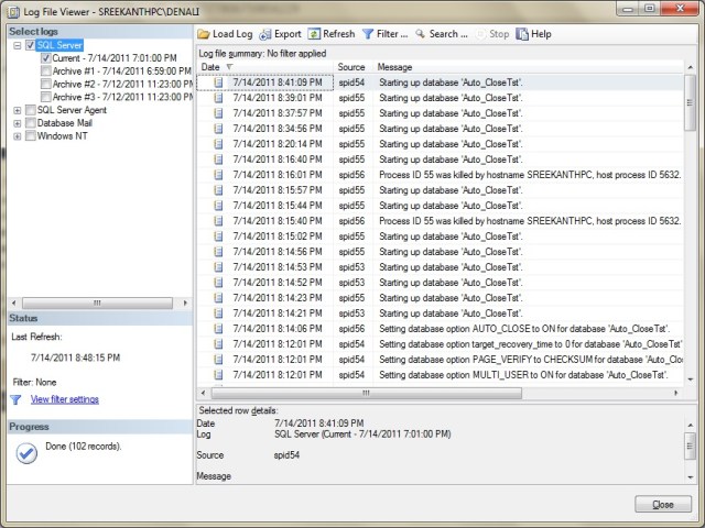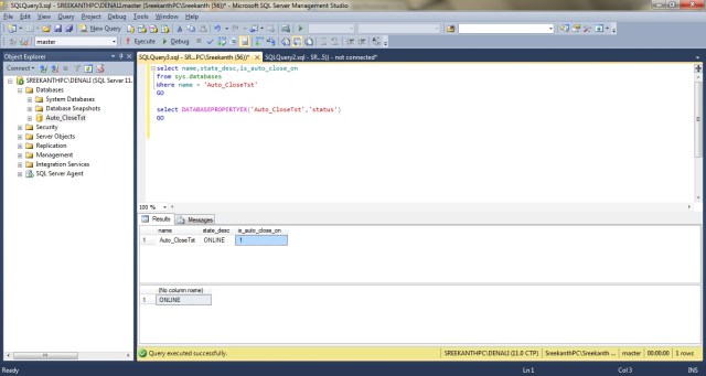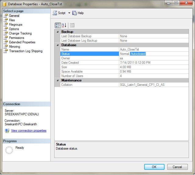hmmm….What does it mean?? Well, It’s basically saying that “Auto Close” is turned ON and since all the Connections are dropped It’ll show you the status as- “Normal/AutoClosed/Shutdown“. Once any session is opened on this database, the “Autoclosed” from above screenshot will disappear! It’s time to poke my fellow DBA why this has been enabled on his Database.