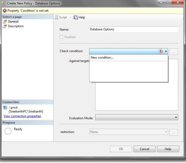 Once, you click on “create new condition”, you’ll be welcomed with a new screen as shown below. Give any appropriate name for your condition and choose one facet from the drop down as shown below. I this case I’ve to choose Database Options Facet, because i’m creating a policy to evaluate DB Options.