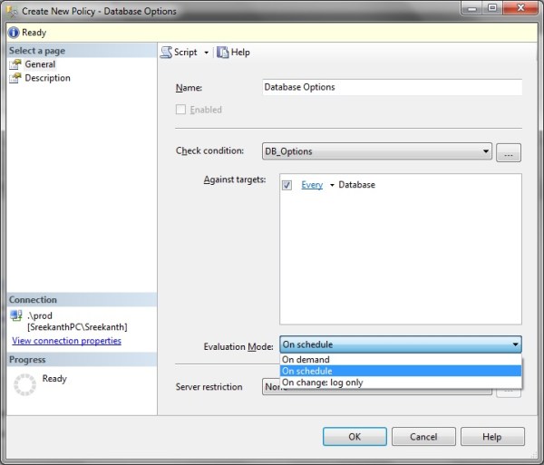 Once done, now you have choose your targets(I selected against every Database) and evaluation mode(I’ve selected on schedule and created one to run/evaluate on daily basis) as shown below.