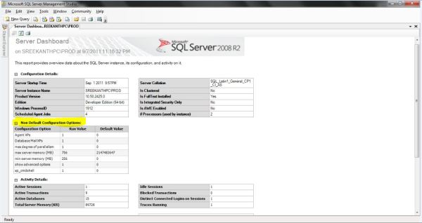 Server Dashboard: This is a very useful report especially for a DBA to understand his Instance Configurations, Settings at a very high level in a single glance. I really like this guy and would recommend you to open this fab report as frequent as you can on your Server.