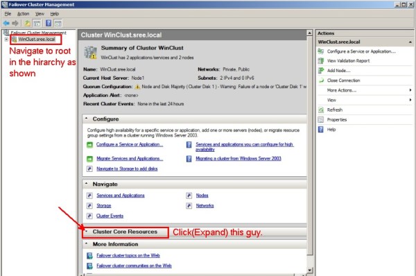 All you’ve to do is to Navigate to the Main Windows cluster and expand “Cluster Core Resources“(This will be collapsed by default) as shown below.