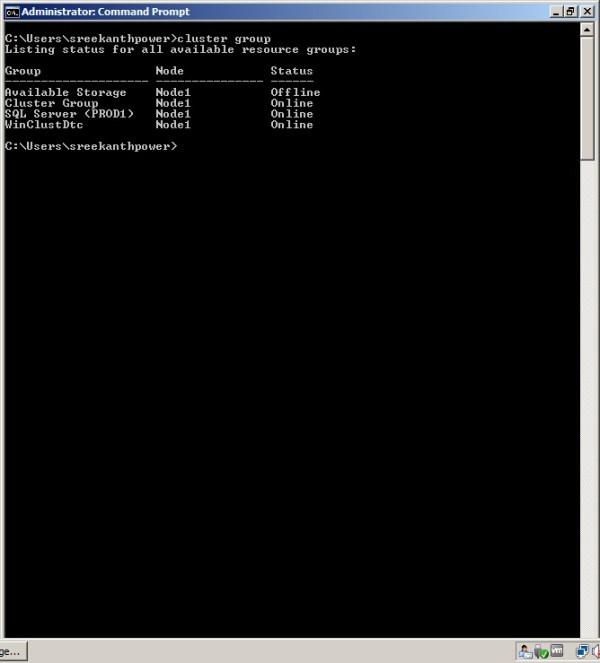 If you are more CMD/PS person, One Simple Way to get the list of all the Groups within our Cluster from CMD is just typing “CLUSTER GROUP” from your Command Prmt! You can see the Below Screenshot from one of the nodes in my Failover Cluster.