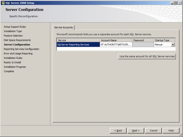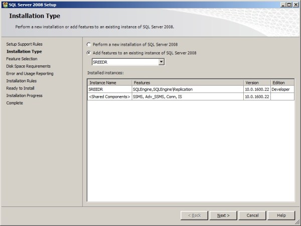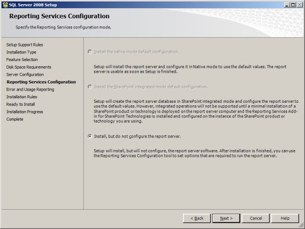 Since I’m installing on a machine which already has SQL Server Instance(In other words, adding feature to existing Named Installation of my SQL Server) Option 1 is greyed out for me. Also, Since I don’t have MOSS, Option 2 is greyed Out. So, at this point Report Server S/W will be Installed, but we’ve to manually configure SSRS by navigating to SSRS Config Manager.