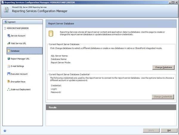 Once Web Service URL has been setup, navigate to Database tab, select on Change Database Button. This is the place where you can select the Database(s) aka Report Catalogs names and select your Instance and respective credentials. I’m going to select SREEDR Instance. At this moment, there are no databases on this Instance and no SSRS related Logins!