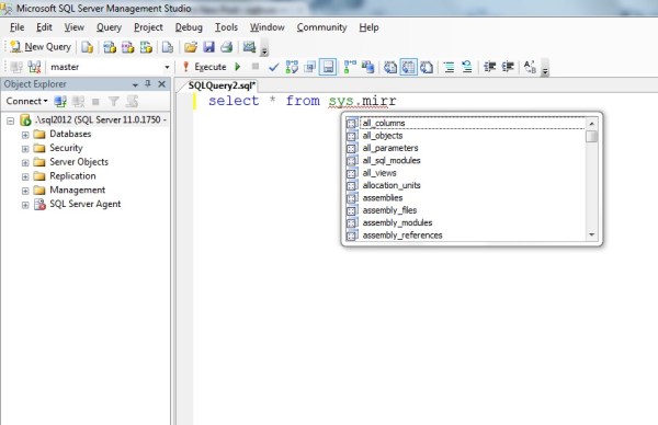 I’m assuming whoever reading this post is already aware of SQL Server 2008 SSMS brand new Enhancement “IntelliSense”. Being said that, was “IntelliSense” really Intelligent enough upto SQL Server 2008R2? IMHO, It’s not really smart enough to read our minds! But WHY?? Because, It’s not smart enough to recognize a word in middle of your Object name! For Example, if you need information regarding DB Mirroring Endpoints, you’ve to actually start your typing with “SYS.DATABASE_MIRRORING_*******”. With all the new hundreds and hundreds of DMO’s available, it’s really difficult to remember each and every starting word of a DMO. It would be really nice if SSMS is smart enough to return all the Objects if it finds a word anywhere in the Object name. I mean, in the above example It should display a list of all DMO’s even though we just type “SYS.MIRR” irrespective of where the word “MIRR” actually present.