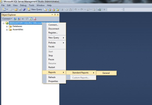 Right Click on the Instance and navigate to Reports->General as shown below.