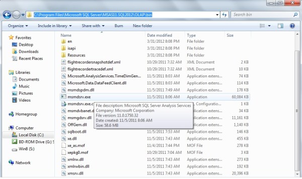 Or…2nd Method: Simply navigate to the folder where SSAS binaries are Installed and locate “msmdsrv.exe” and simply hover your mouse!…In my case it’s “C:\Program Files\Microsoft SQL Server\MSAS11.SQL2012\OLAP\bin”. See below