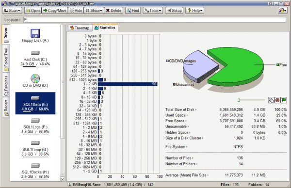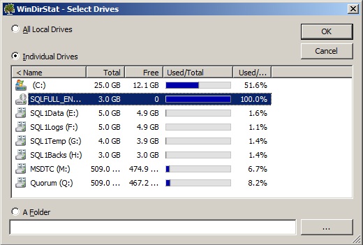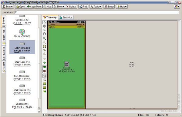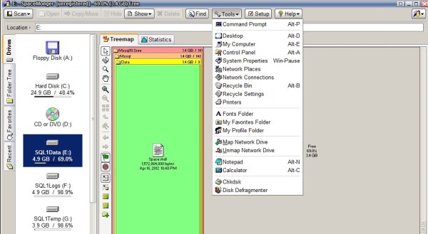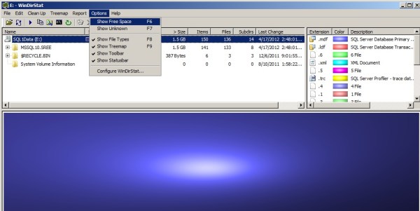 Let’s explore the “Show FreeSpace Option” by looking at my SQL Data drive. You can enable this option by hitting F6 or enabling from Options Menu as shown below.