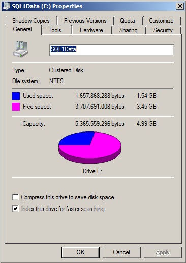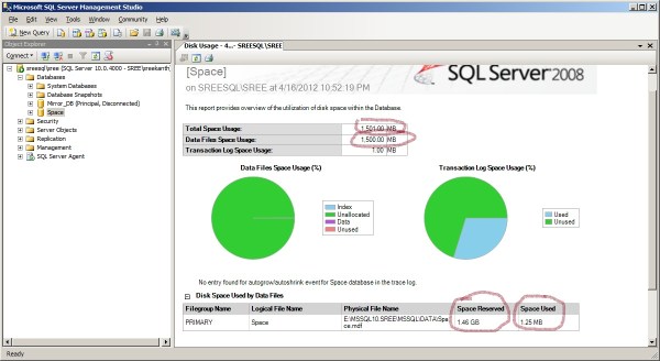 Before proceeding any further, I’ve a empty database named “space” which is 1.5 GB in size. See below how it looks from SSMS and from My Computer. Basically 1.5 Space has been reserved by SQL Server and OS sees it as 1.5 GB full.