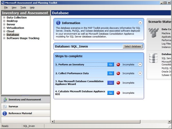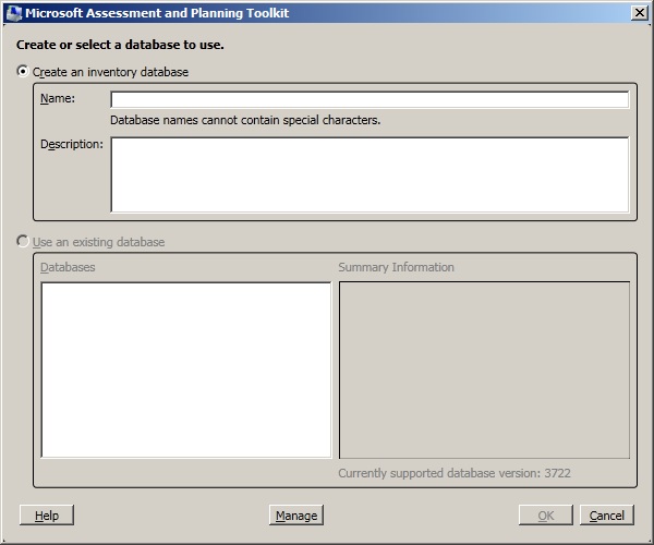 Step1: You will be welcomed with the below screen where you’ve to create an Inventory DB(I named it as “SQL_Inven”) for the First time. (You can create separate Databases for separate Discoveries, eg: One DB for SQL Servers, another for Exchange, another for VMWare Servers etc).
