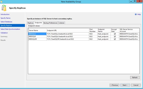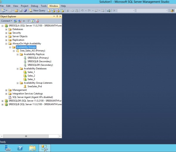 In my Lab, SreeSQLA is my primary(prod) Instance and SreeSQLB is sitting in the same datacenter(for HA), where I’ll be using Synchronous Mode and assuming SreeSQLB is my DR Site and I’ll be using Asynchronous Mode. (So, I have 3 Replicas in total…Primary replica at my Production Site and 2 Secondary Replicas at SreeSQLB and SreeSQLDR).