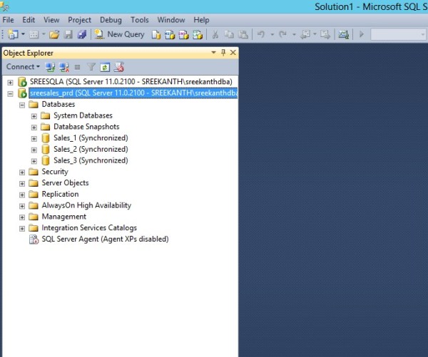 Step1: I created 3 Databases on my Production Server(SreeSQLA) and placed full backups on my share.