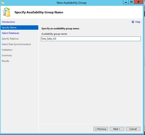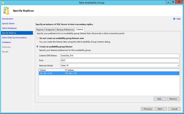 Listener: This is the one which clients connect to and which floats across machines. As you can see I specified a Name, Port and IP for this Listener. Note – Each AG can have only one Listener. Recommended not to use DHCP for IP in your Prod Environments. We’ll be using different subnet for our DR site in real world, for that all you have to do is, add another Static IP from your DR Server Subnet. – Starting SQL Server 2012 we’ve OR Dependency for your IP’s! ( Well, you may need to work with your Network Team for this for all your Static IPs mumbo jumbo)