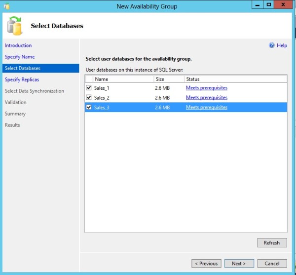 Step4: Select your Databases you want in your AG. (You can see below where it says all the Prerequisites are met 🙂 )