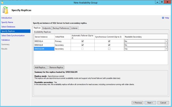 Adding Replicas – I Clicked on Add Replica Button and connected to SreeSQLB and SreeSQLDR and chosen Primary and Secondary roles as per my requirement as shown below.