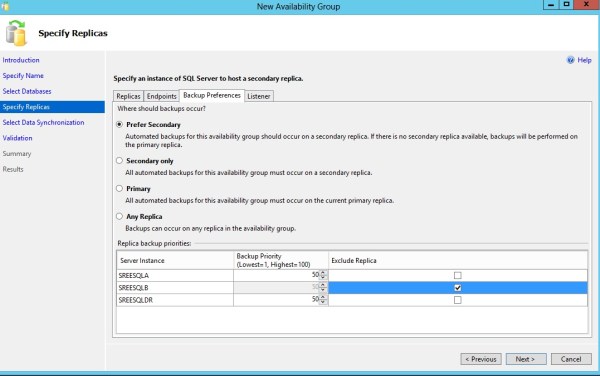 Backup Preferences: I selected to allow Backups only on My Secondary replicas and I avoided SreeSQLB as shown below. ( You can select as you wish depending on your requirement)
