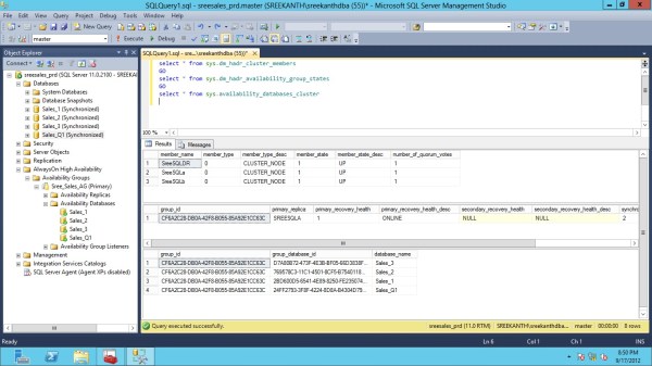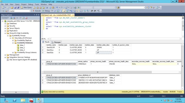 At a glance, you can see 3 Databases currently Sales_1, Sales_2 and Sales_3 participating in my AG. Also you can see only 2 nodes out of 3 are Powered Up(See SreeSQLDR status as Down) and the Primary Replica is SreeSQLA.