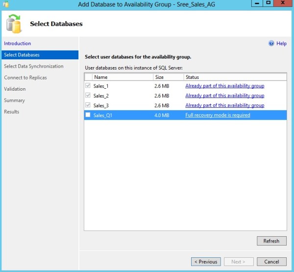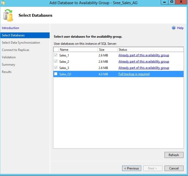 In this post, let us see how to add a new database to an existing AlwaysOn Availability Group. Let’s assume we’ve a sales AG already in place and application team requested us(DBA) team to add one more Database to this Group as they need them to be available all together. For this Example let’s assume the new Database Name is “Sales_Q1” – Of Course this would be more realistic Name in your Real world deployments!