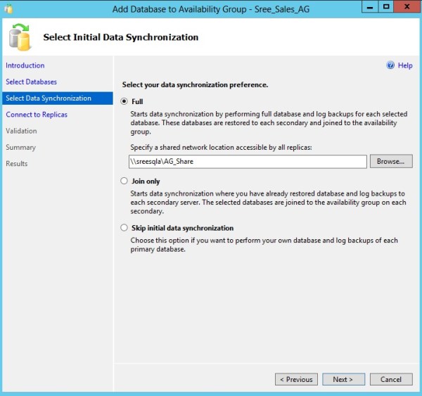 Step 5: Now it’s time to choose how do you want to start synch. I’ve selected Full by providing the share(I placed by backup here) where all my nodes participating in my AG have access to.