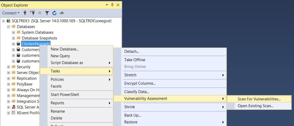 I have a database named “ChickenNuggets” which I would like to know what are the potential security risks it has. Well, All I need to do is connect to SQL Instance from SSMS 17.4 or above and Right click on the database and go to tasks and navigate to VA and do a scan. See below screenshot for what I am talking about.