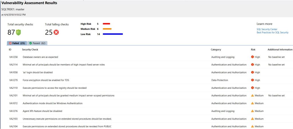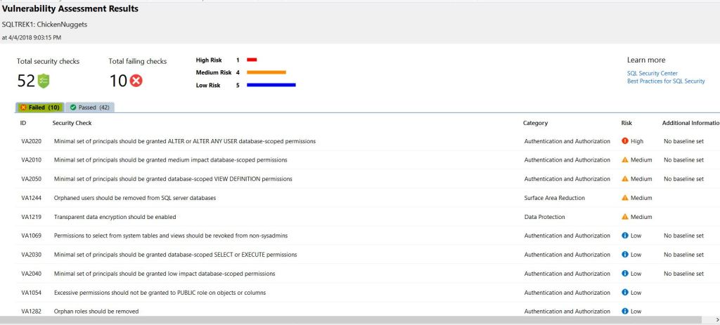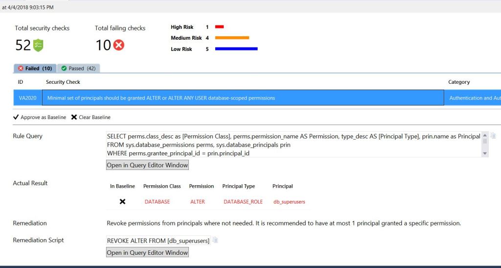 As you can see, it reported 10 failed checks for this DB. Also, You can select any item and approve as baseline if that’s normal in your environment, That way SSMS doesn’t include that particular item under failed list as it has been included in baseline.
