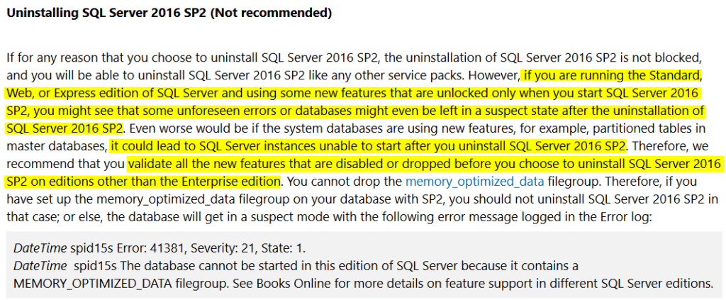 Make sure you go all the way to the bottom of the page regarding GOTCHAS with uninstalling 2016 SP2 if needed. This is the section which I would like you guys to focus on if you are not on Enterprise Edition.