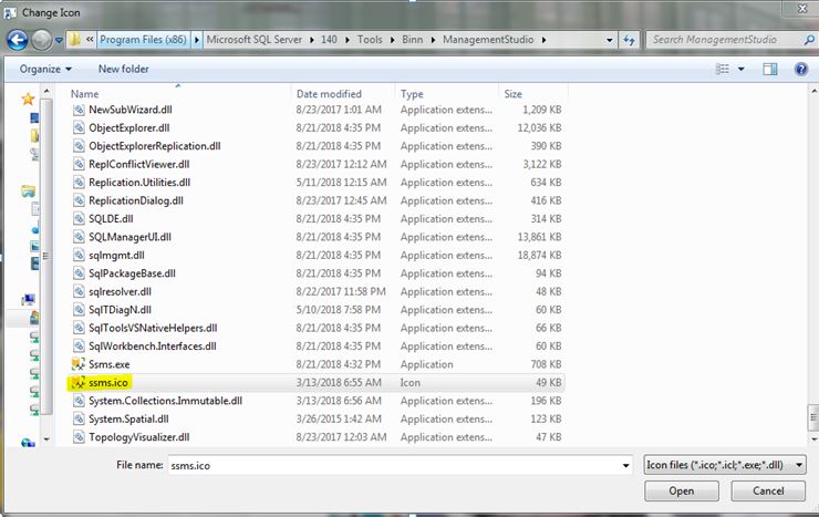 In my case it’s “C:\Program Files (x86)\Microsoft SQL Server\140\Tools\Binn\ManagementStudio” and select “ssms.ico” and hit open–>OK–>Apply–>OK.