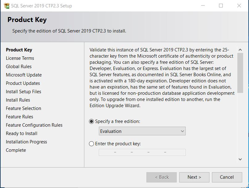 Note: If you have previous releases of 2019 CTP installed on the same machine, you can’t perform an Inplace upgrade to CTP 2.3, However you can have them side by side without any issues. In other words, It’s not required to uninstall previous release of CTP in order to Install 2019 CTP 2.3 as a different Instance.