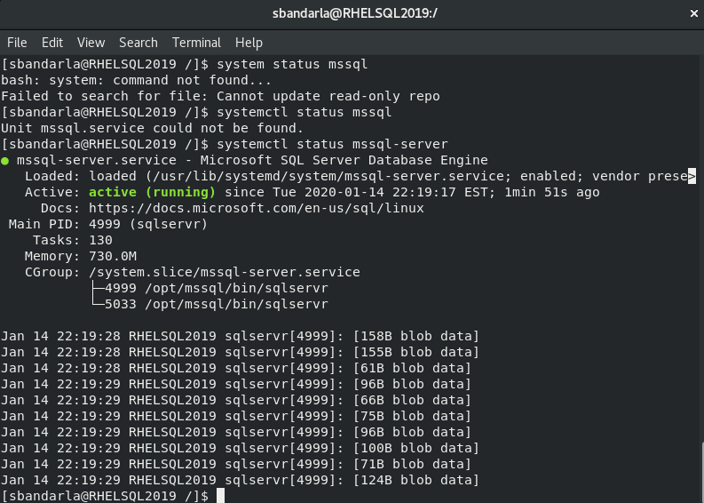 Check status using either ps-ef | grep mssql-server or systemctl command as shown below.