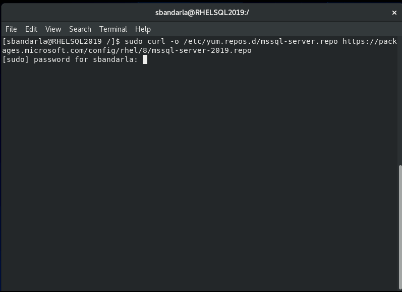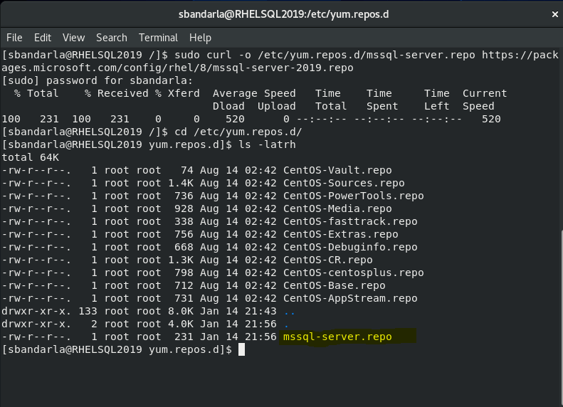 sudo curl -o /etc/yum.repos.d/mssql-server.repo https://packages.microsoft.com/config/rhel/8/mssql-server-2019.repo