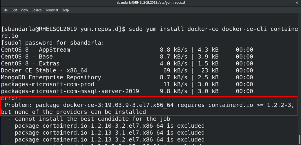 Problem: package docker-ce-3:19.03.9-3.el7.x86_64 requires containerd.io >= 1.2.2-3, but none of the providers can be installed.