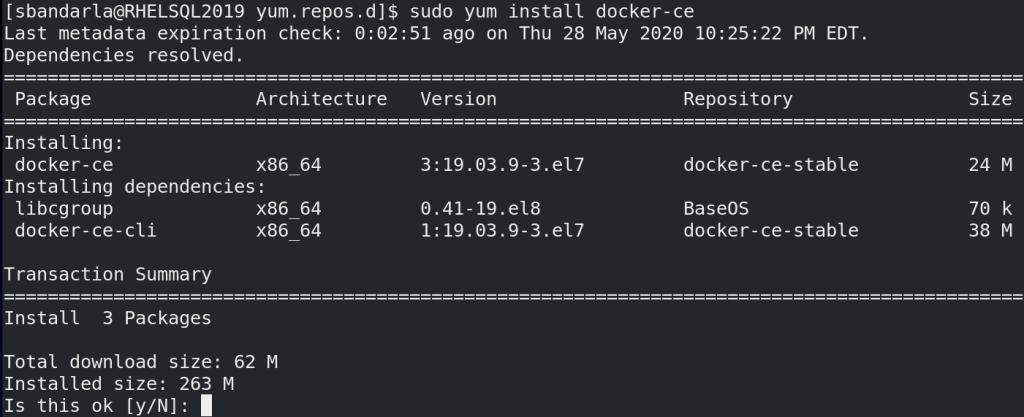 Great, now it’s time to install docker-ce package which also takes care of dependent docker-ce-cli package.