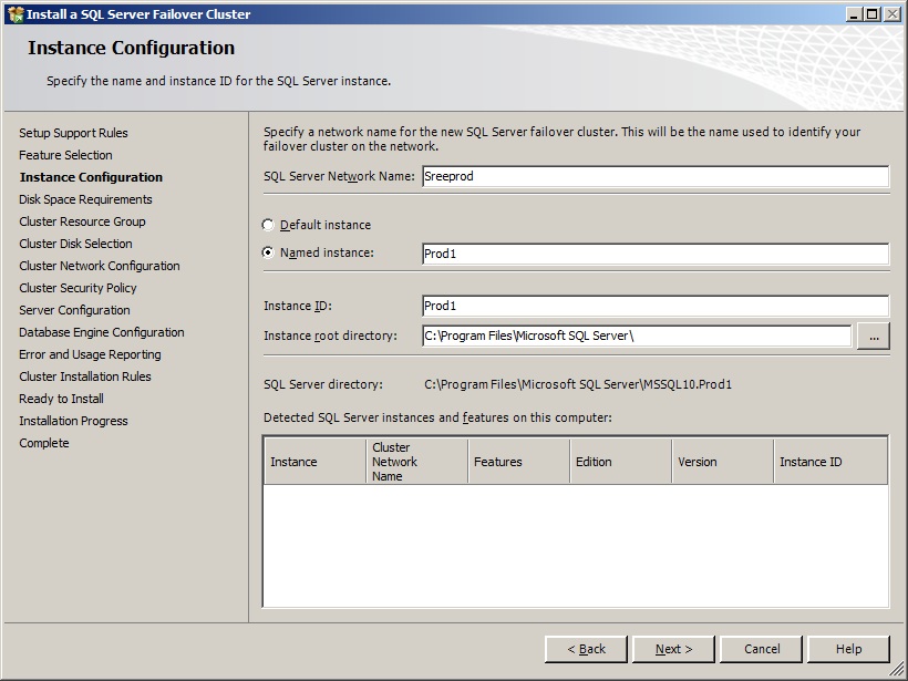 It’s upto you what to choose. In this Demo I’m selecting only bare minimum Database Engine and SSMS components considering my Server Configuration. Click Next and you will be asked for Instance Configuration. here I’ve chosen “sreeprod” as my SQL network name and i’ve selected named Instance(prod1) as shown below, which makes my work easy if i’ve any plans to make it an Active-Active cluster in future.