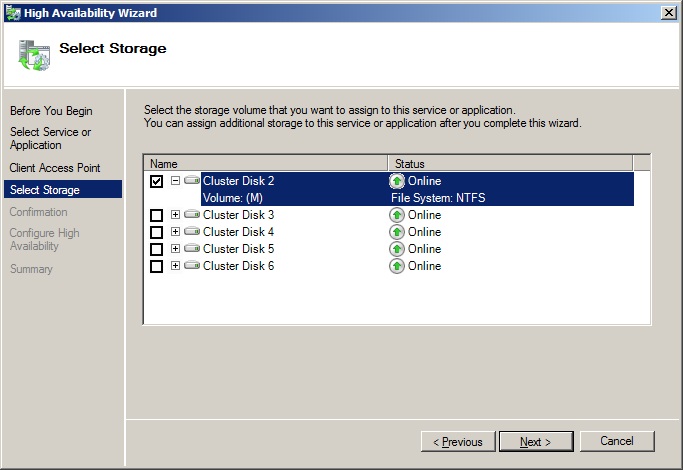 Click Next and now it’s time to configure our Disk Drives, In the below Screenshot, you can see Disks 1 and 2 are already reserved for Quorum and MSDTC, so you’ll have an option to select from remaining Disks. In this case, I’ve chosen all the available disks for me.