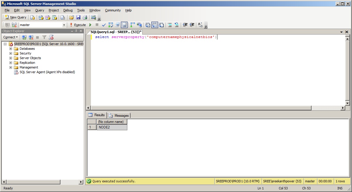 select serverproperty(‘computernamephysicalnetbios’) to verify the current physical node under which SQL is running under as shown below.