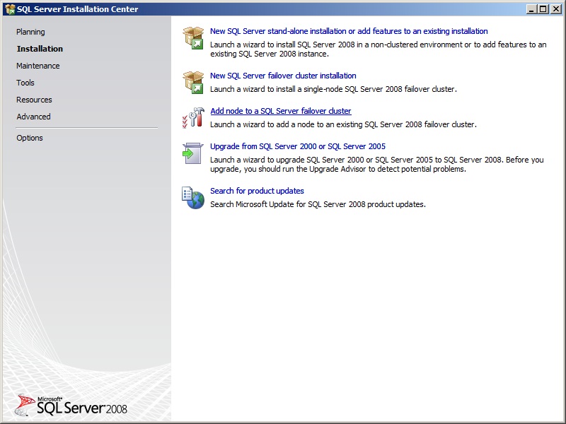 Open you setup.exe and again annoyingly on my Node2 as well it asked me to install (KB942288) which i did just by clicking OK and it required a restart of your machine:( Well, once rebooted i opened my setup.exe and now I’m welcomed with typical SQL Server Installation Screen. This time You’ve to choose “Add Node to a SQL Server Failover Cluster” in the below screenshot.