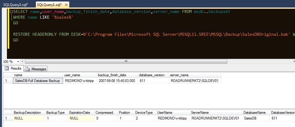 Also, If you have the original backup file, you can simply do a RESTORE HEADER ONLY for even more info…or you can also query msdb..backupset. See below Screenshot to see what am talking about…