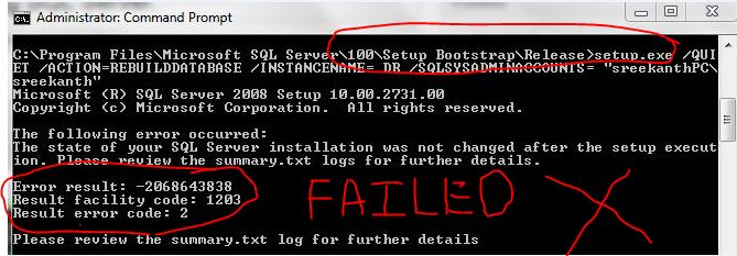 setup.exe /QUIET /ACTION=REBUILDDATABASE /INSTANCENAME=DR /SQLSYSADMINACCOUNTS=”sreekanthPC\sreekanth” /SAPWD=”Pa$$w0rd”
