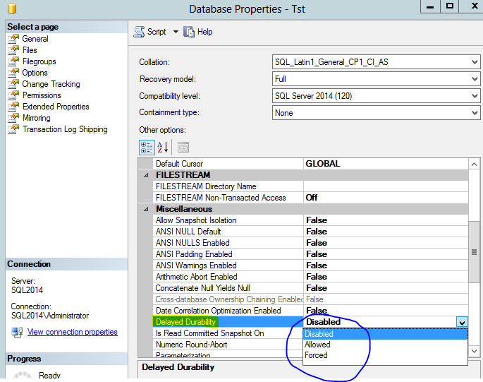 ALTER DATABASE DB_Name SET DELAYED_DURABILITY = {Disabled|Allowed|Forced}