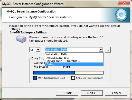 Step 6: Now, Choose where you want your InnoDB TableSpace (Data files) to be Placed. See the below Screenshot.