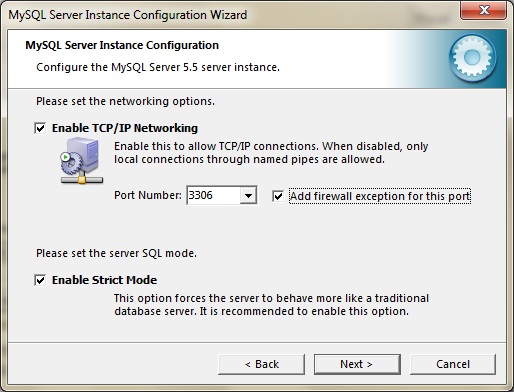 Step 8: Network/TCP IP Settings. By default MySQL TCP Port for communications is 3306(Remember, it’s 1433 for SQL Server). You can change it if needed, make sure that you’ve checked “Add an exception to this Port” Button as shown below.