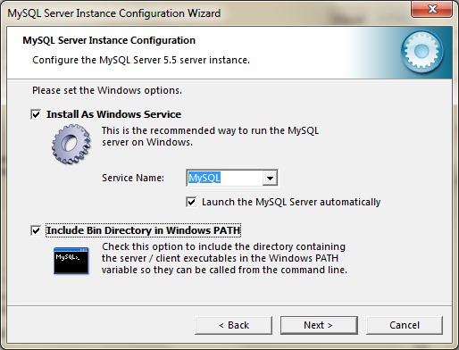 Step 10: Choose Install MySQL as a Windows Service and Check “Include BIN Directory in Windows Path” checked as shown below.