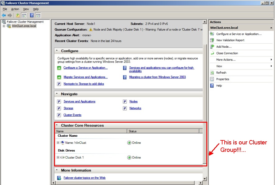 Anyways, let’s see where can we see the cluster Group in Failover Cluster Manager in Win Server 2008. Assuming you’ve already Installed FCS(Failover Cluster Service), once you navigate to your Administrative tools and open Failover Cluster Manager(GUI to Manage your Failover Cluster), you’ll see something very similar to the below Screeshot.