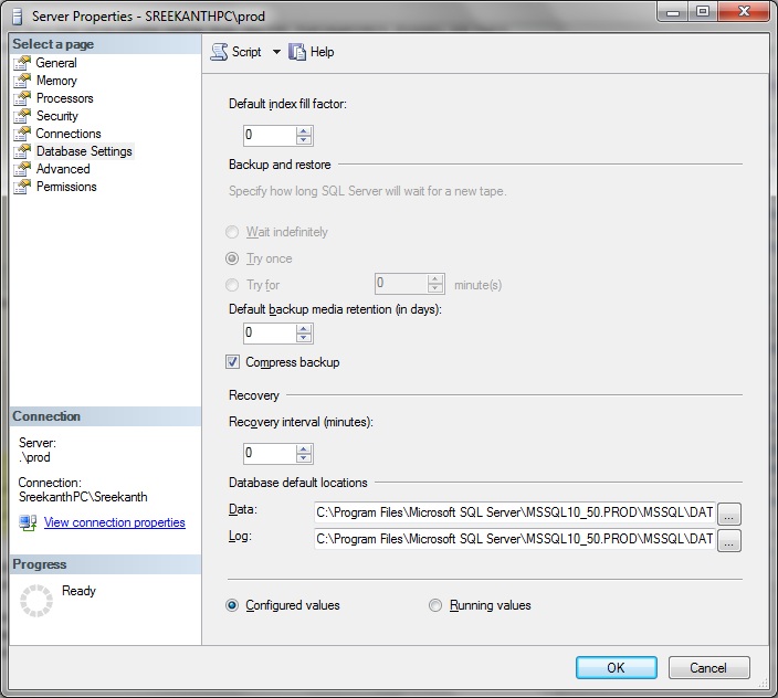 If you recall correctly, while installing SQL Server It’ll ask for all the Data, Log, TempDB and Backup locations. Changing the TempDB files location is pretty simple, can be done just by Alter Database/Modify File and restarting your SQL Instance. Changing Default Database Files(mdf and ldf) files location is also pretty much simple, Just Right click on your Instance in SSMS and select Properties and navigate to Database Settings as shown below…