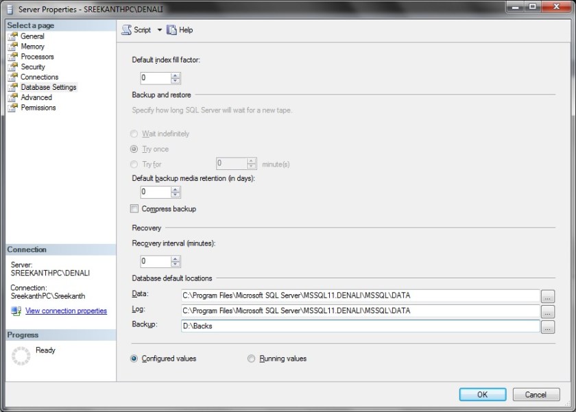 Bottom Line : Using DENALI SSMS you can change the Default Backup Location for your SQL Server DENALI Instance as well as SQL Server 2008R2 Instance without digging into Registry Values.