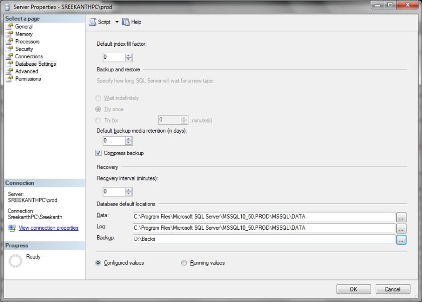 Have you ever been in a situation thinking, why MSFT did not included an option to change default backups location in SSMS? Well, I was in few cases!! The good news is they’ve given that Option in DENALI SSMS….Yes Guys you heard it right!! So no more digging into Scary Registry values to change those settings 🙂 In this post let’s see how this can be achieved now running on 2008R2(This applies to SQL 2005/2008 and 2008R2) and also..let’s see how to tweak this option even on earlier Versions of your SQL Server using DENALI SSMS without getting our hands dirty touching Registry values 😉