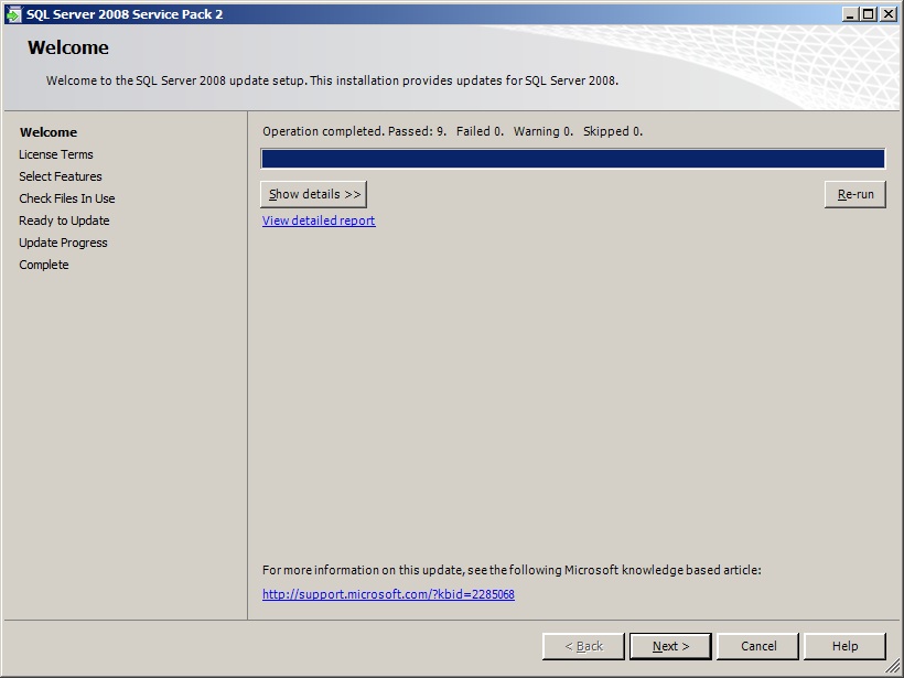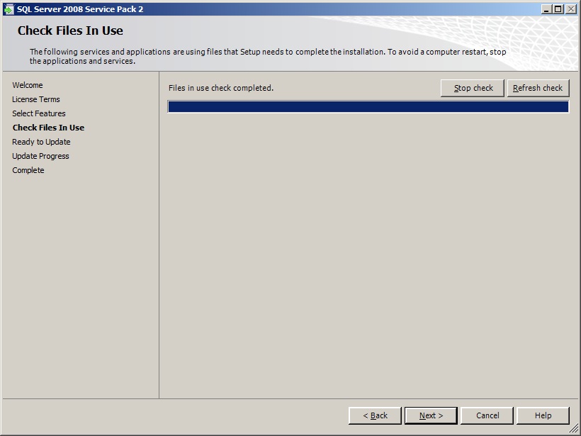Next and It’ll perform a basic Check for any Files in Use which might prevent successful installation of SP2 as shown below.
